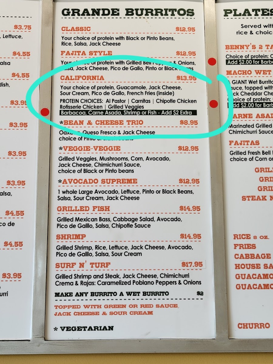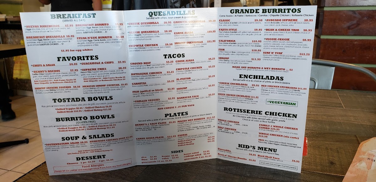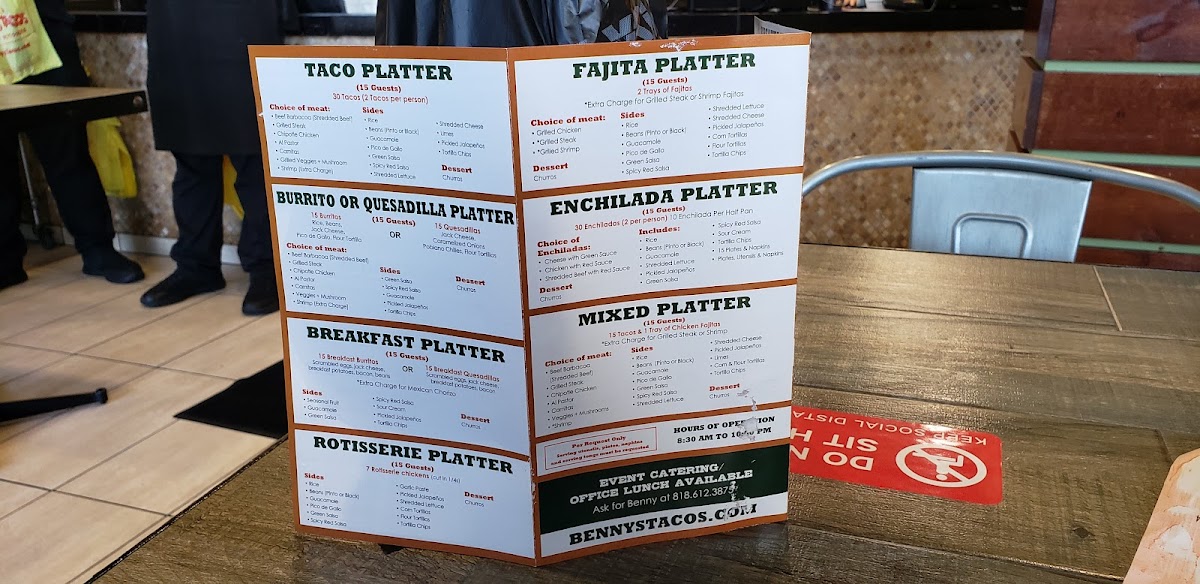 The menu is a delight, featuring the Benny's 2 Taco Plate—two hearty tacos paired with Spanish rice, beans, and guacamole. For those seeking a feast, the Family Burrito Platter serves up six classic burritos brimming with your choice of protein, alongside salsas and churros. Not to be missed are the Tostada Bowls, particularly the carnitas and carne asada options, which shine with fresh toppings.